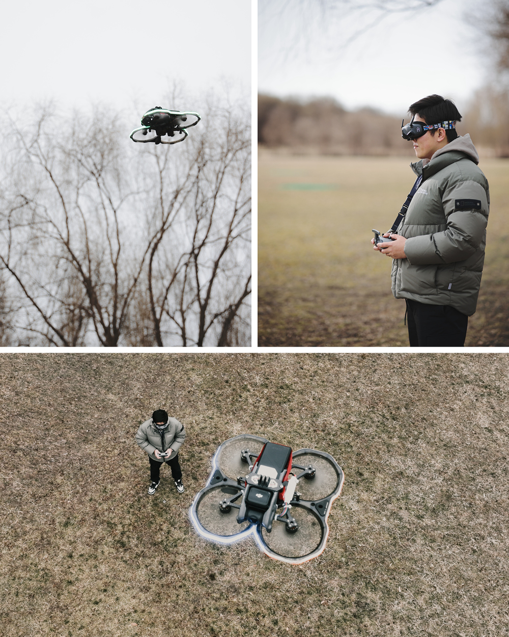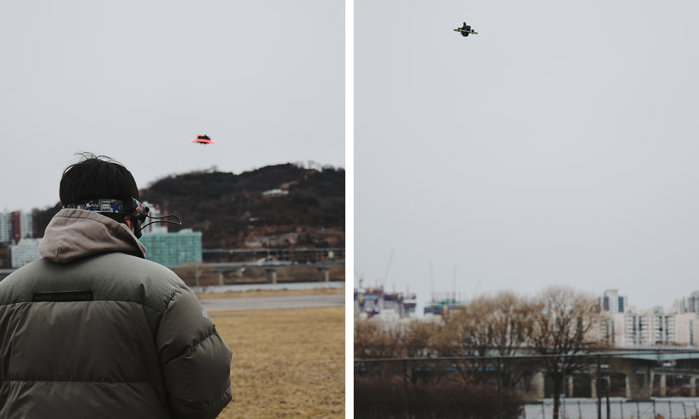 제가 날리는 드론은 FPV 드론으로 ‘First Person View’의 약자입니다. 단순히 시계 비행이 아닌 고글을 통해 드론에서 촬영되는 영상을 실시간으로 눈앞에서 보면서 날리기 때문에 실제 비행하는 것과 똑같이 느껴져요. 앞뒤 좌우 상하, 어느 곳 하나 막히지 않은 하늘에서 비행할 수 있죠. (물론 갑자기 새가 나타나면 마음이 살짝 불편해지지만요) 공간에 제약을 받지 않고 자유롭게 날 수 있기 때문에 정말 해방감이 크고 가슴이 뻥 뚫리는 기분이 들어요.