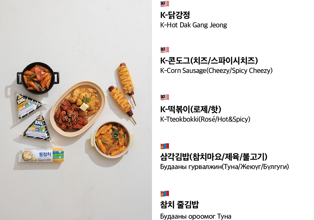 K 붙은 즉석조리식품은 아묻따 일등이죠. 매콤달콤한 냄새 풍기면서 맛깔스럽게 볶는 떡볶이와 닭강정을 해외에서도 맛볼 수 있어요. 간편하면서도 알찬 삼각김밥과 줄김밥 등 간편식도 몽골과 말레이시아 고객들의 마음을 뒤흔들고 있다는 후문입니다.