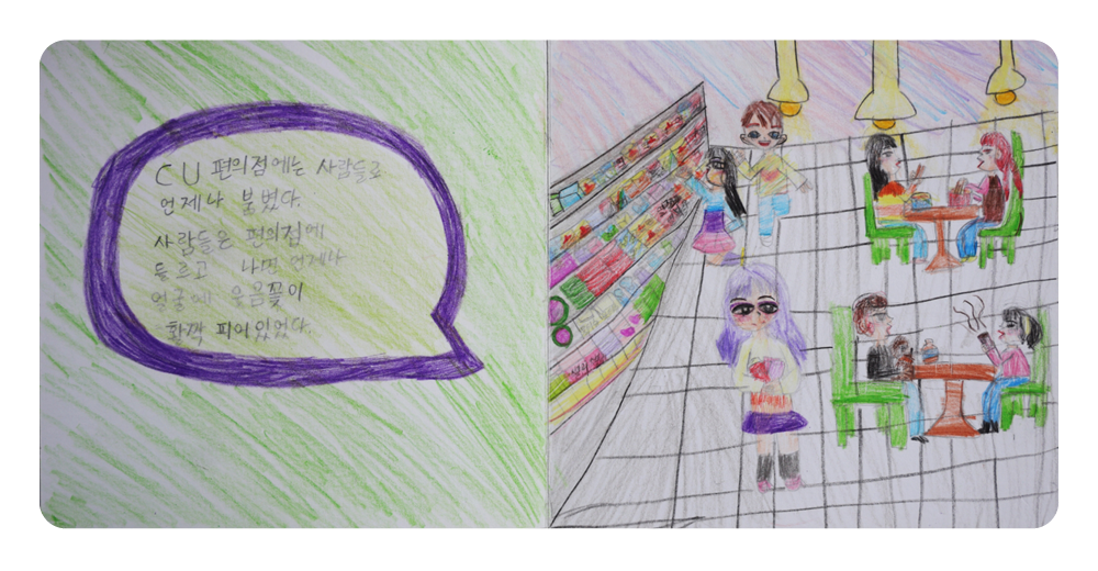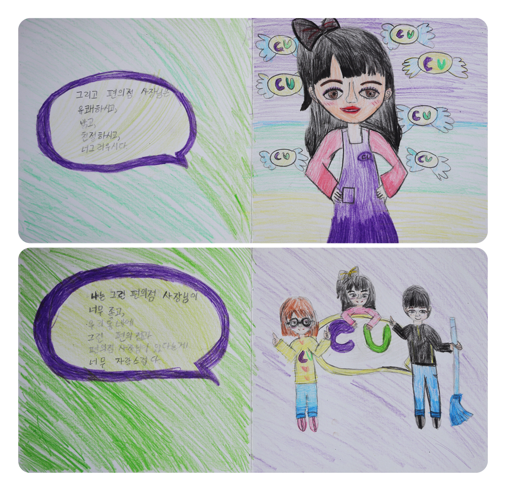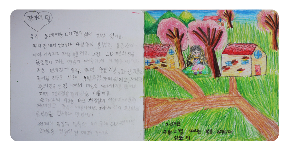 마음을 주고받는 데 익숙한 점주님께도 한 달 전 도이의 깜짝 선물은 엄청난 감동이었습니다. 도이는 평소보다 더 심혈을 기울여 전체 페이지를 채색하고, 특히 점주님 얼굴을 똑같이 그리려 노력했다고 해요. 도이는 CU가 너무 좋습니다. 매일 들르는 곳이지만 그때마다 가슴이 두근두근합니다. 우리 동네 편의점은 항상 깨끗하고 불이 반짝반짝 한다고요. 무엇보다 언제나 웃으면서 도이를 반겨주는 김인아 점주님이 계십니다.