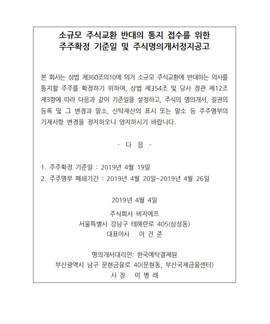 소규모 주식교환 반대의 통지 접수를 위한 주주확정 기준일 및 주식명의개서정지공고